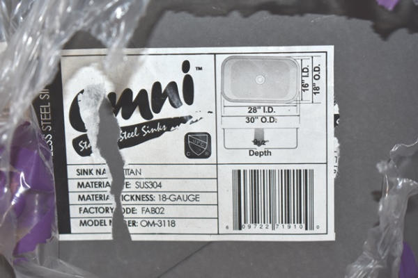 Lot of 3 Omni single bowl stainless steel sinks, overall outer dimension is 30"