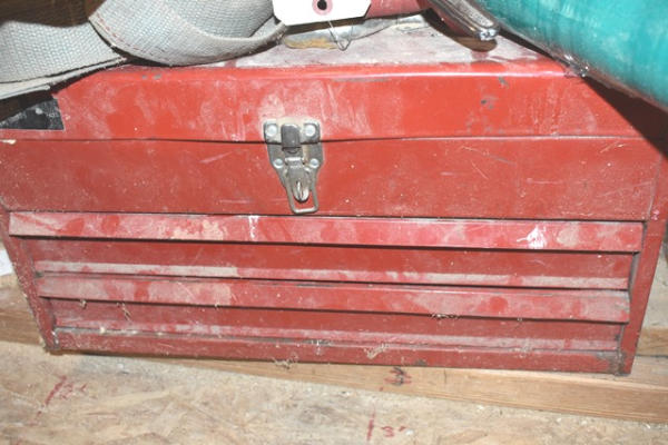 Rest of bench contents consisting of gas cans, toolbox, mop pail