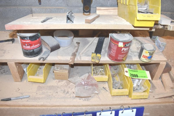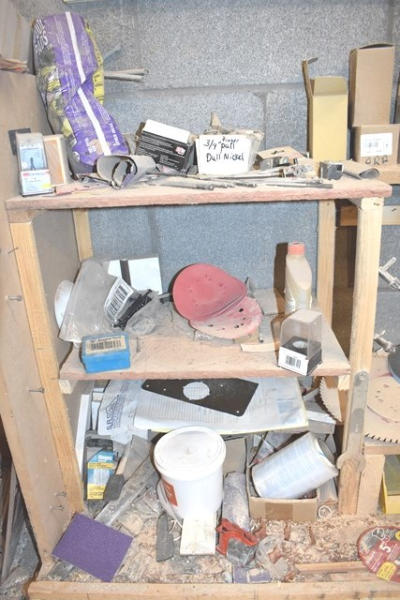 Contents consisting of Bondo, nails, screws, wood conditioner, stapler