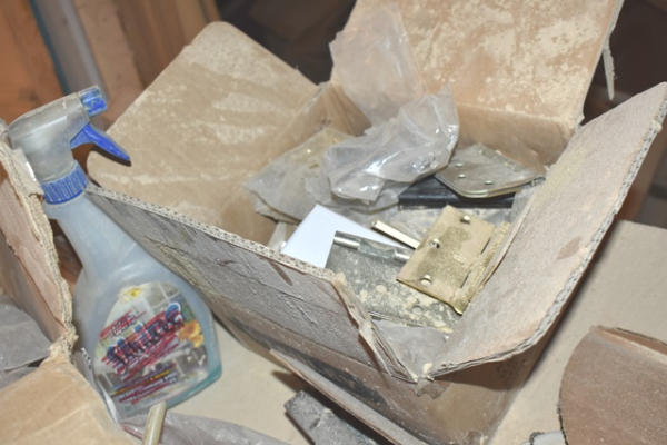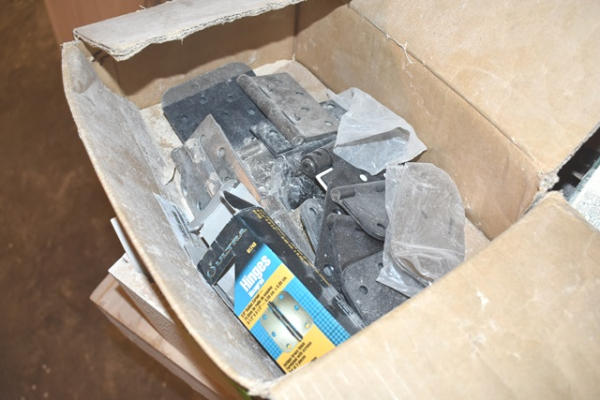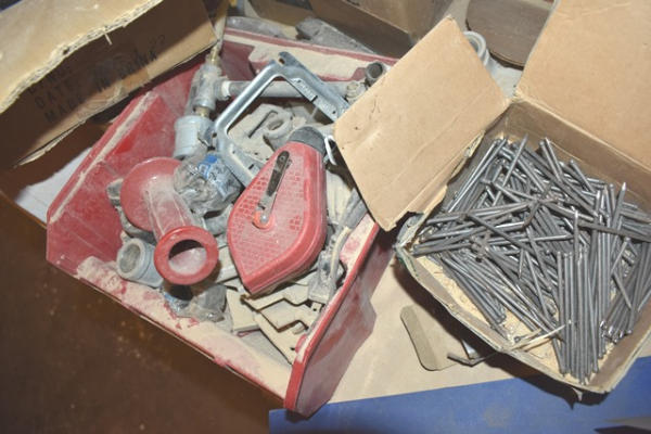 Work bench contents consisting of hinges, pipe fittings, etc.