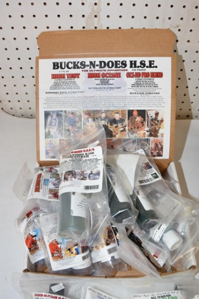 Lot of hunting scents including bear attractants, doe estrus, wind directional powder, GTX Clothing Wash Concentrates, etc.