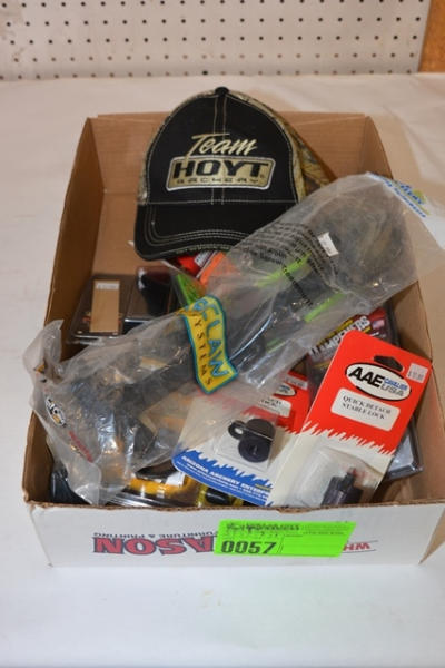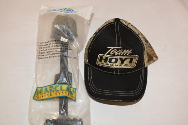 #57 – Lot includes a Bear Claw Quiver, universal, right or left hand, 7 1/2" of adjustment, accepts all broadheads, Team Hoyt Archery baseball cap, braided bow sling, Whisper Biscuit replacement biscuit, Quick Detach Stable Lock, True Triple Turkey Mouth Call, Hoyt Pro Hunter Deluxe Wrist Sling, etc.