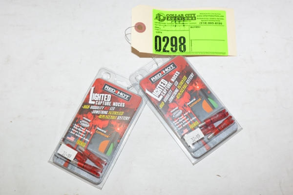 Lot of 2 sets of Red Hot Lighted Capture Nocks, high visibility LED, bow string activated, with replaceable battery, powered by Lumenok