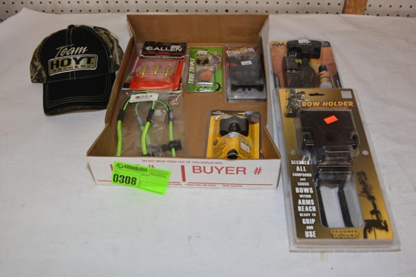 Lot includes bow holder, accessory hanger, Orien LED hat clip light, Hoyt Pro Hunter Deluxe Wrist Slings, Allen crossbow broadheads, etc.
