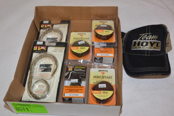 Lot includes a Team Hoyt Archery baseball cap, Hoppes #9 bore snakes for .44, .45 pistol, 6MM, .240, .243, .244 rifle, etc.