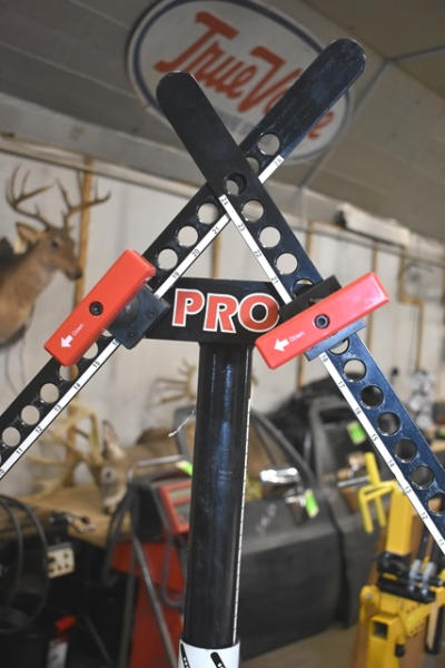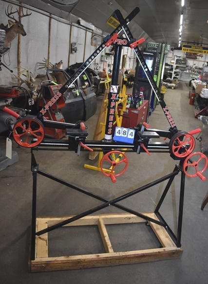 X-Press Pro Adjustable Bow Press on homemade stand with wheels