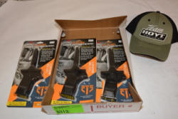 Lot includes bow holder, accessory hanger, Orien LED hat clip light, Hoyt Pro Hunter Deluxe Wrist Slings, Allen crossbow broadheads, etc.