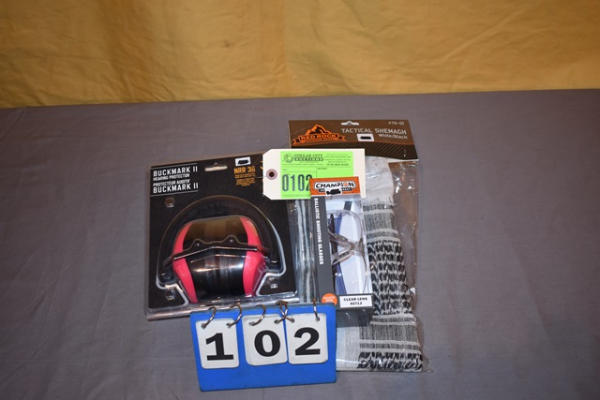 Buckmark II NRR 36 ear muffs, tactical shemagh, safety glasses