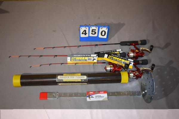 (3) ice fishing polls, paradox gun cleaner, ice skimmer