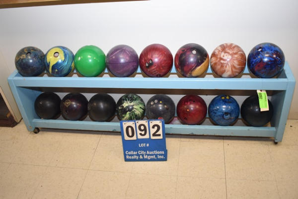 Bowling ball rack with 16 bowling balls, approx. 74" x 12"