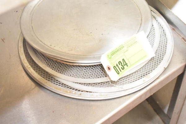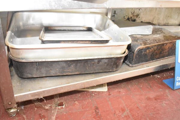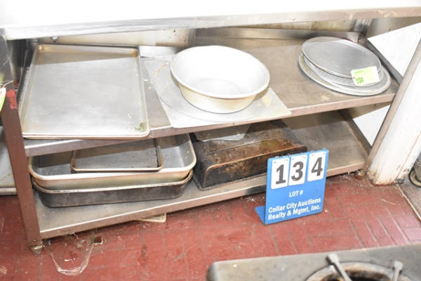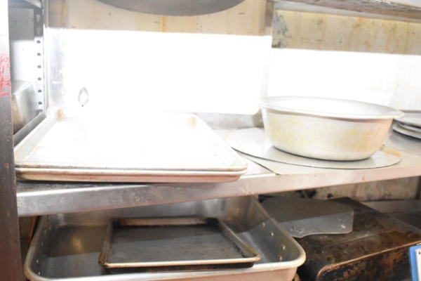 Shelving unit contents consisting of sheet pans, pans, pizza pans and screens