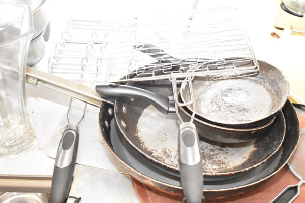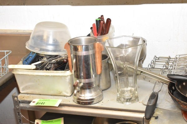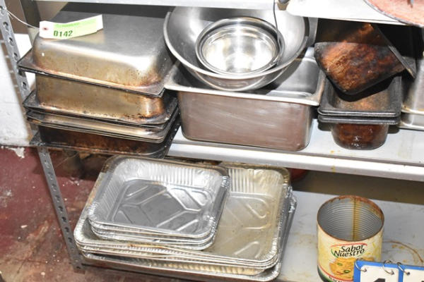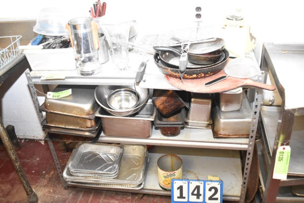 Contents of shelving unit, consisting of flatware, inset pans, frying pans, etc.