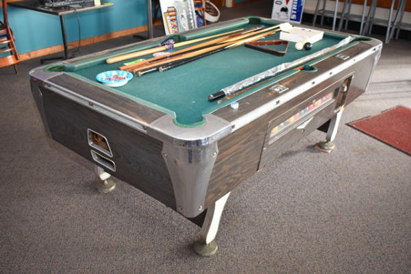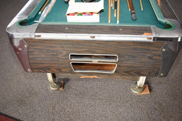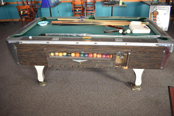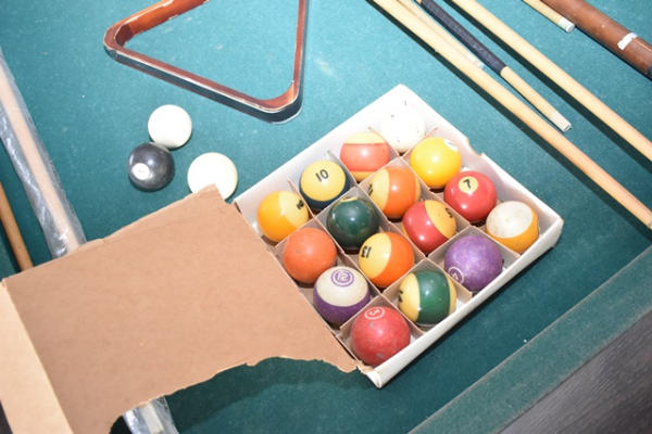 Pool table, no keys, includes assorted pool cues, chalk, pool balls