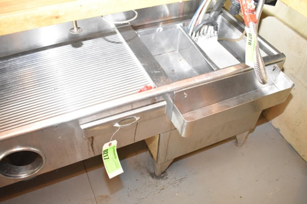 3-bay under-bar sink with ice bin and drying racks, approx. 120" long x 26" deep x 37" tall including backsplash
