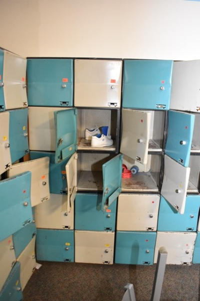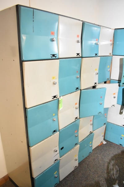 Corner section of lockers, includes 1 key, approx. 88" x 22" x 75" and 58" x 22" x 75"