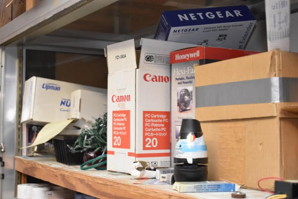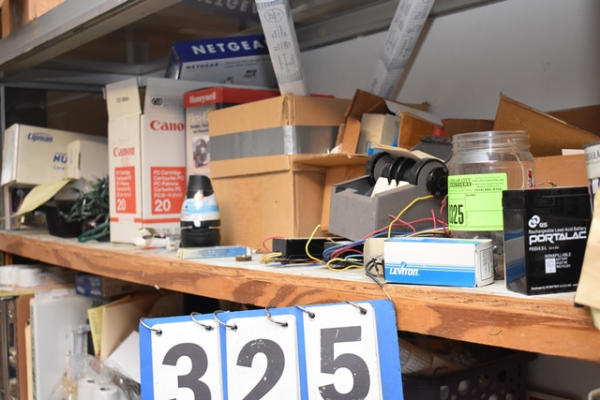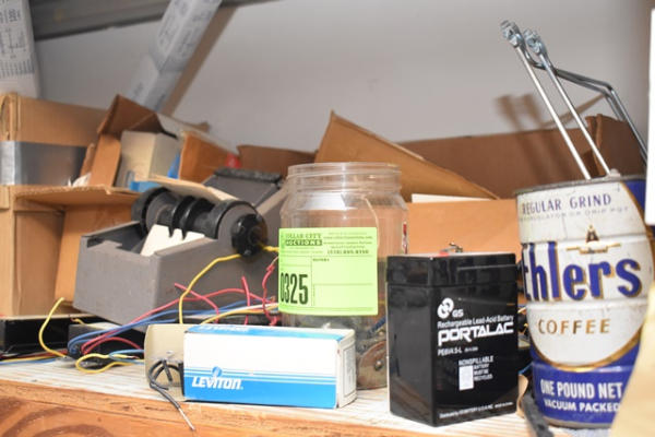 Shelf lot including Christmas lights, ballasts, light bulbs