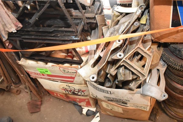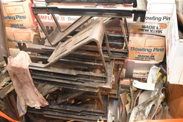 Lot of 3 cases of bowling pins, assorted bracketry, wheels, etc.