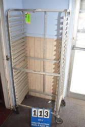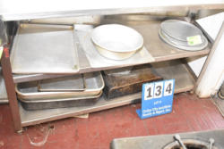 Shelving unit contents consisting of sheet pans, pans, pizza pans and screens