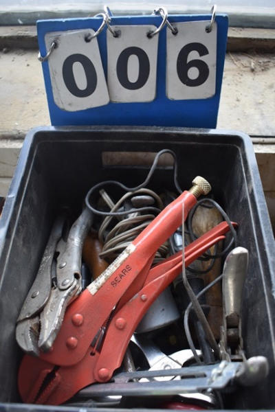Box lot of tools consisting of vise grips, automotive tester, etc.