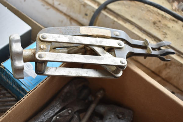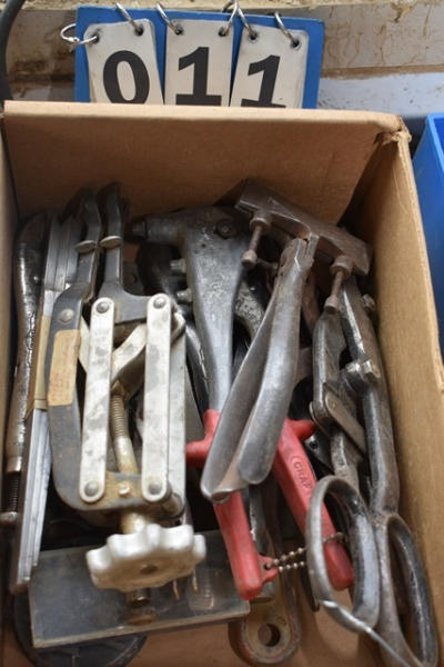 Box lot of tools consisting of vise grips, punches, leather punch, tin snips, etc.