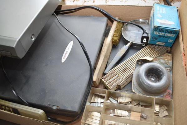 Oritron DVD player, Compaq Presario laptop, wire brush, etc.