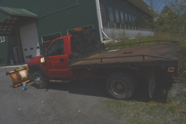 2001 Chevy 3500 Duramax Diesel, 6.6 turbo, automatic, 4 x 4, dually, 8'6" plow, flatbed, gooseneck hitch, VIN: 1GBJK341X1E306344, approx. 108,718 miles, runs, moves (TITLE AVAILABLE AT REMOVAL)