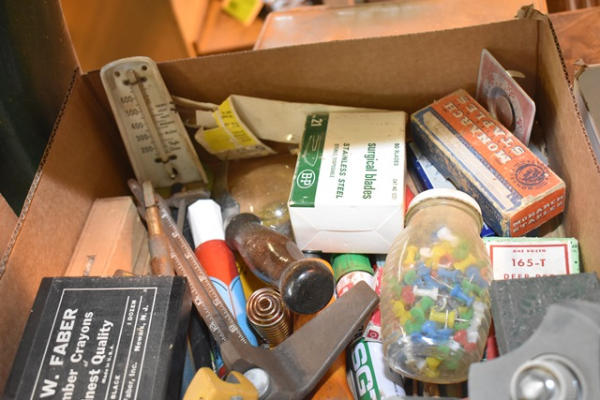 Lot consisting of staplers, screws, small nuts and bolts, office supplies, tape dispenser, etc.