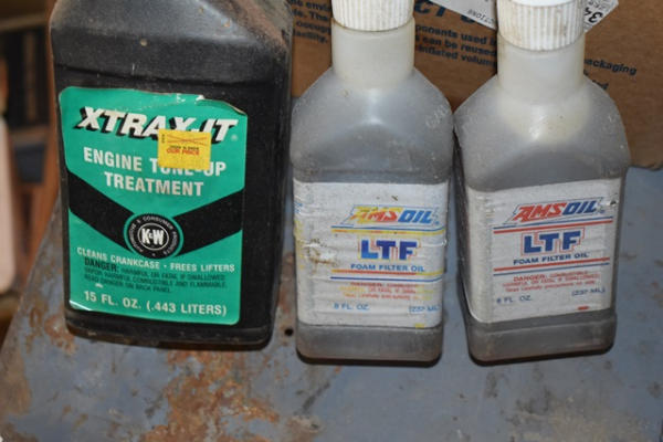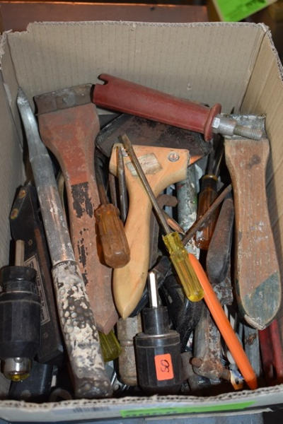 Box lot of tools including scrapers, screwdrivers, etc. Also included is a box of oil