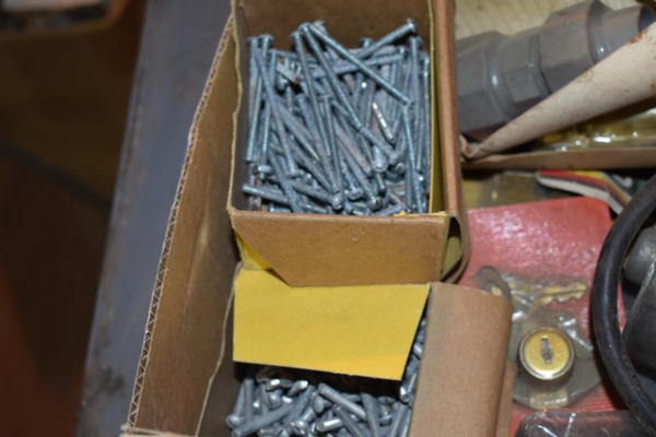 Box lot including electric soldering iron, machinist's screws, etc.