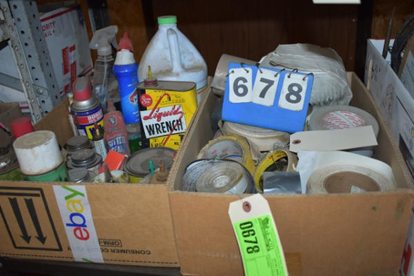 Lot of 2 box lots including tape, Liquid Wrench, WD40, etc.