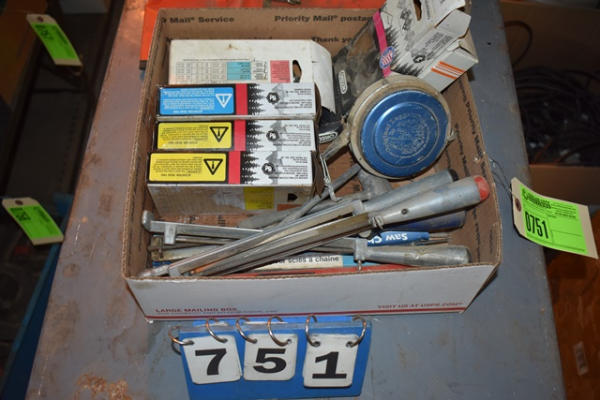 Box lot consisting of chainsaw chains, logging tape, chainsaw files