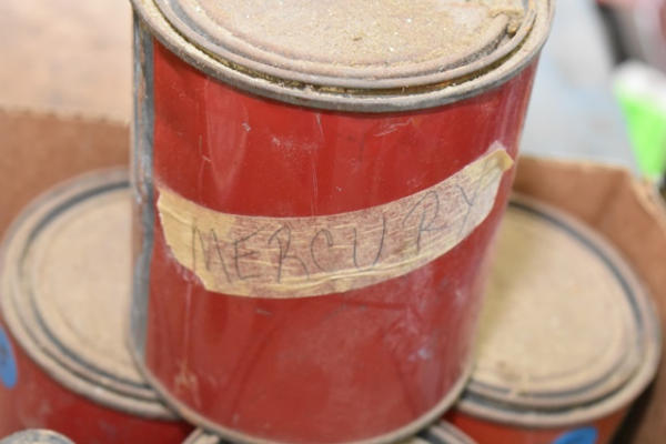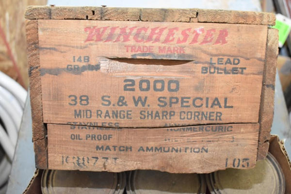 Nice Winchester 38 Smith & Wesson Special wood box, approx. 12" x 12" and cans of Mercury