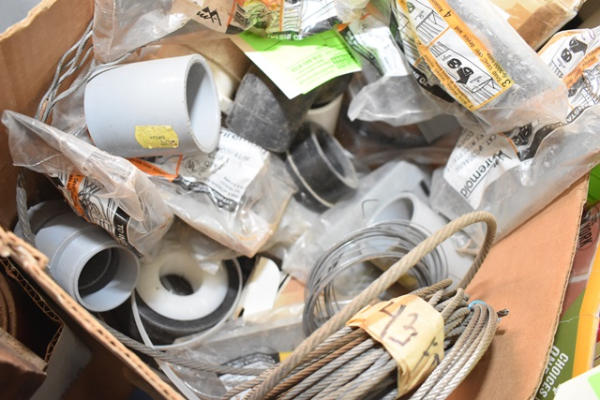 Box lot with conduit, fittings, electrical plates, etc.