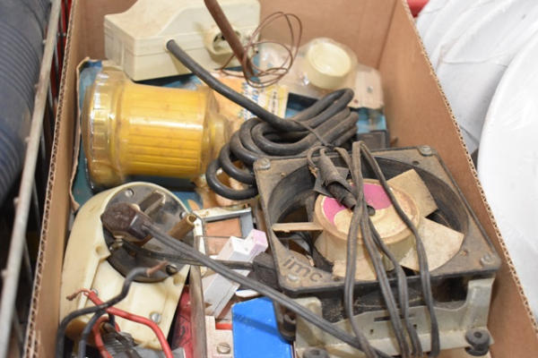 Box lot of electrical items including plugs, fan, door contacts, etc.
