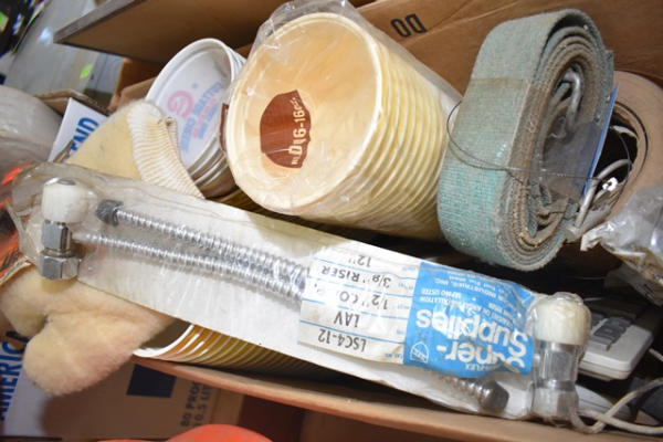 Box lot with hard hat and plastic bowls