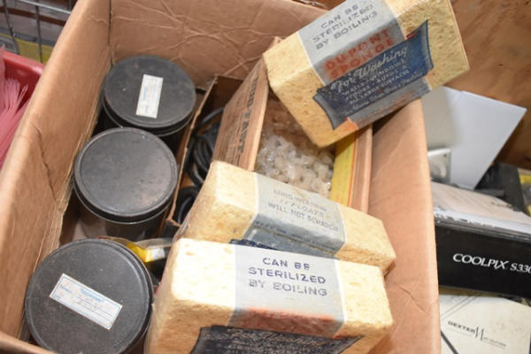 Box lot including sponges, shelf holding pins, Stanley replacement blades, o rings, etc.