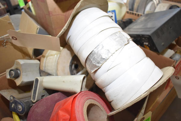 Box lot including red caution tape, danger tape, plastic wire loom, plastic edging, tape gun, hard hat, etc.