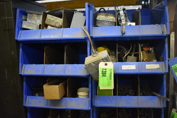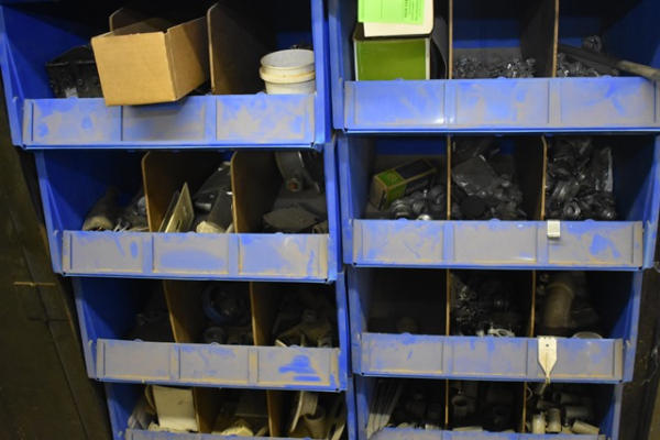 Large parts organizer bin with electrical supplies consisting of boxes, plug ends, conduit connectors, etc.