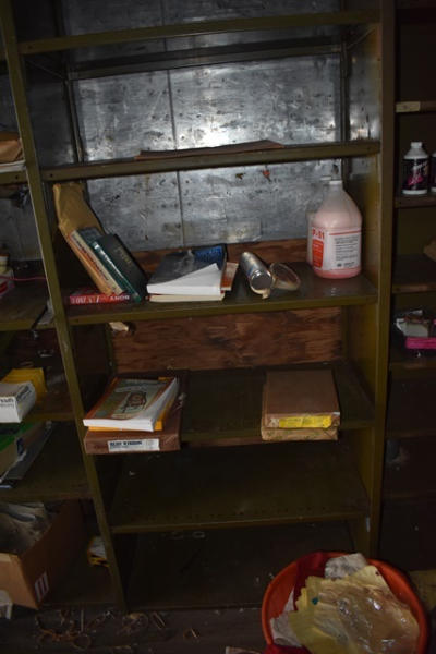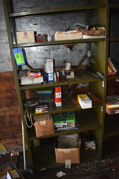 Shelving unit with contents consisting of office supplies, brake fluid, etc.