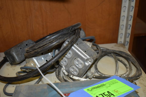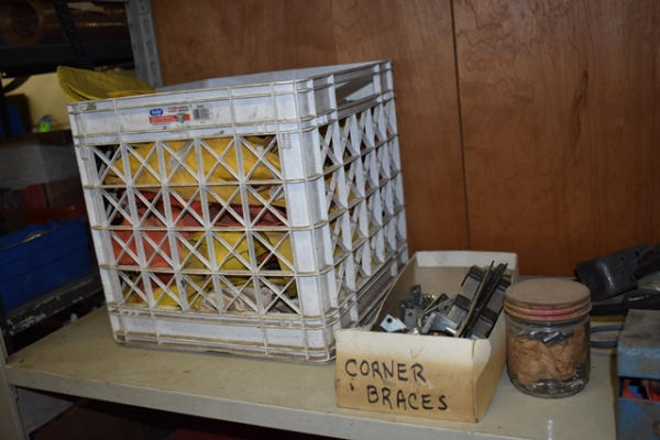 Shelf lot with corner braces, outlet boxes, rain gear, etc.