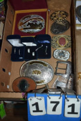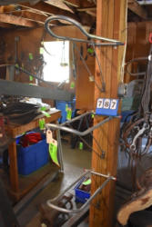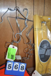 Box lot of assorted combs, leather saddle cross, breakaway stirrup, chain hooks, etc.