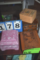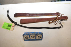 #1534 - Lot of spur straps in a wooden Soapie Ponies box including 8 piece natural color, 2 piece straight natural, 9 pair dark brown.