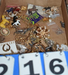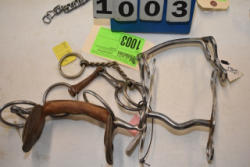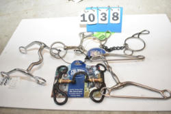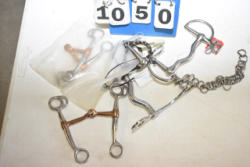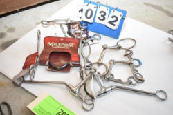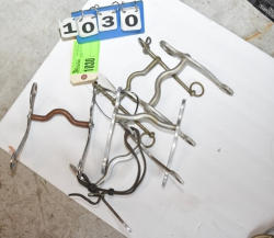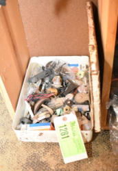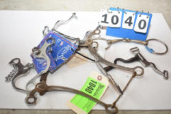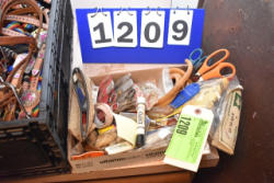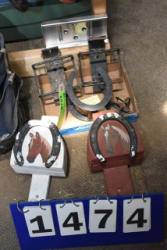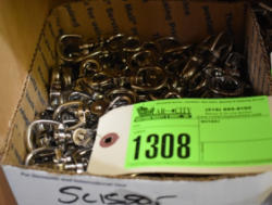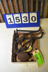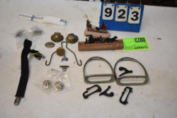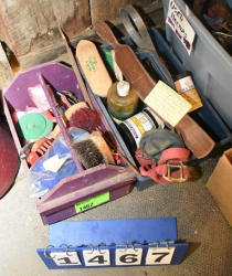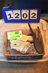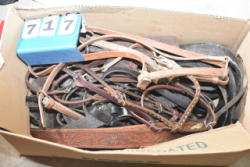 #1535 - Box lot of assorted combs, leather saddle cross, breakaway stirrup, chain hooks, etc.