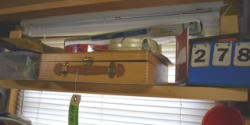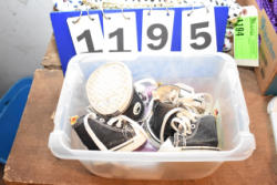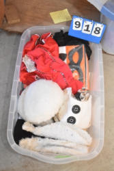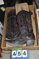 #1497 - Tote lot of shipping and fly boots, Baker fly boots, red shipper, 2 of 2 blue quilt, etc.