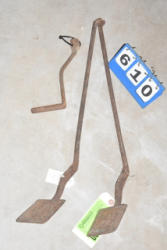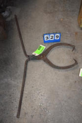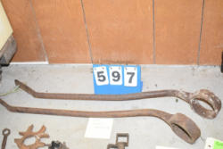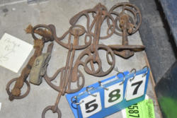 #1530 - Lot of 3 10" large cast iron hooks, 1 5" hook, 1 4" hook and 1 old cow bell