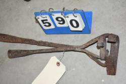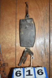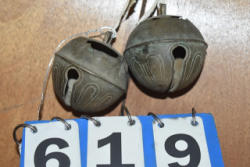 Lot of 3 10" large cast iron hooks, 1 5" hook, 1 4" hook and 1 old cow bell