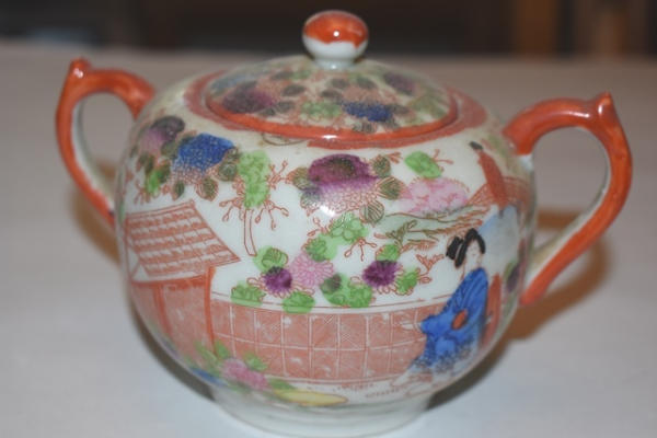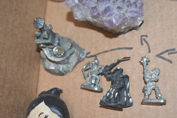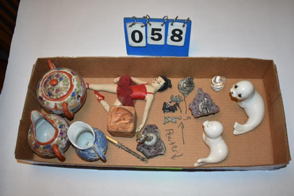 Box lot of knick knacks including seals, crystal, computer, sugar and creamer containers