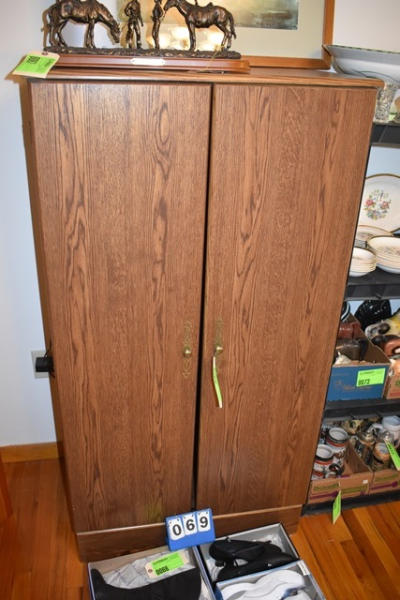2-door cabinet, 32" wide x 60" tall, wardrobe style with shelving on one side and clothing rod on other side