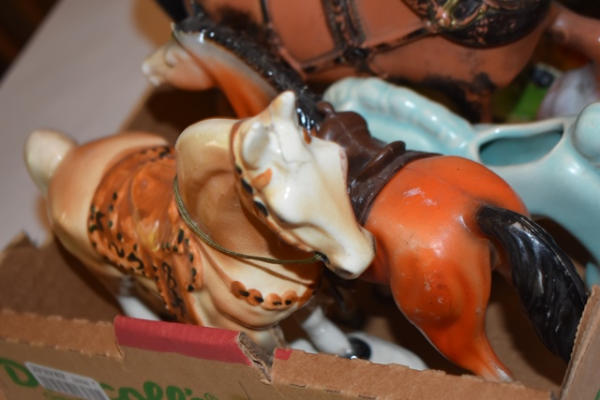 Lot of ceramic and plastic horses, including vintage chalkware