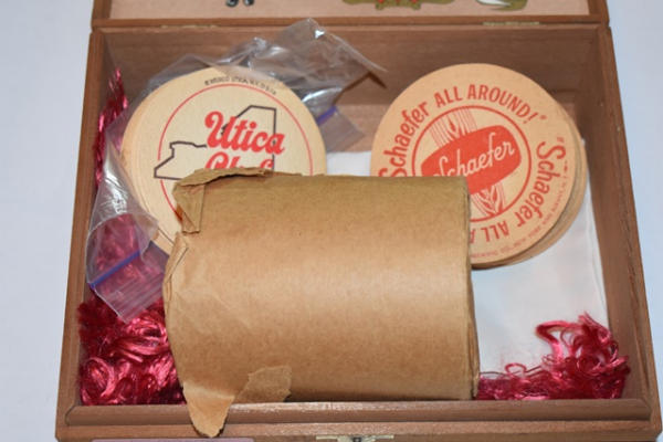 Box lot consisting of assorted vintage beer related coasters and the US Navy Sweetheart, Newport, RI pillow sham